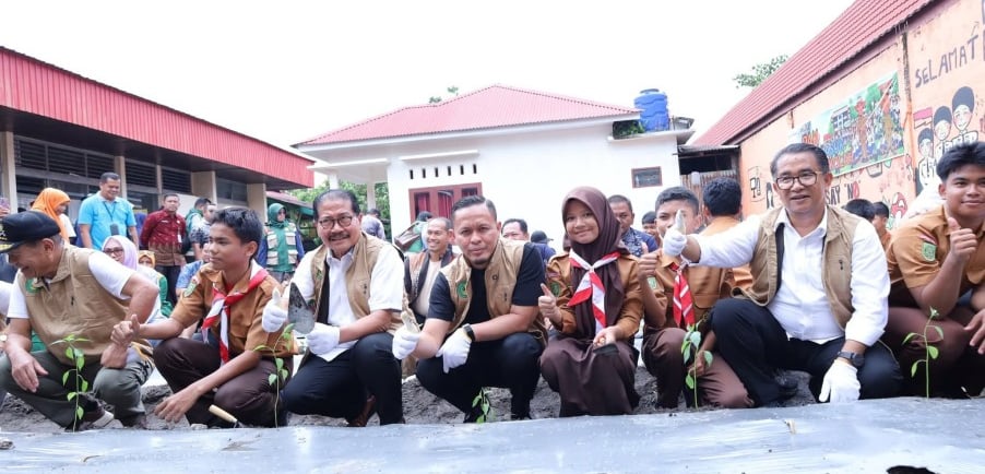 Walikota Pekanbaru Agung Nugroho, melakukan penanganan program swasembada pangan berbasis sekolah di SMPN 8, Kamis (4/12/2025).